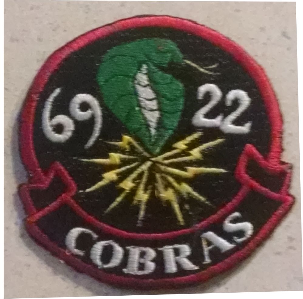 Custom embroidered 6922nd Cobra Unit patch on black patch material with adhesive backer applied to back.